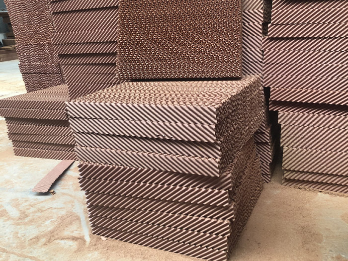 冷风机纸芯的降温过程是在其核心--纸垫内完成的,在波纹状的纤维纸表面有层薄薄的水膜,当室外干热空气被风机抽吸穿过纸垫时,水膜上的水会吸收空气中的热量进而蒸发成水蒸汽,这样经过处理后的凉爽湿润的空气就进入室内了。这自然的过程犹如风吹过水面一样。